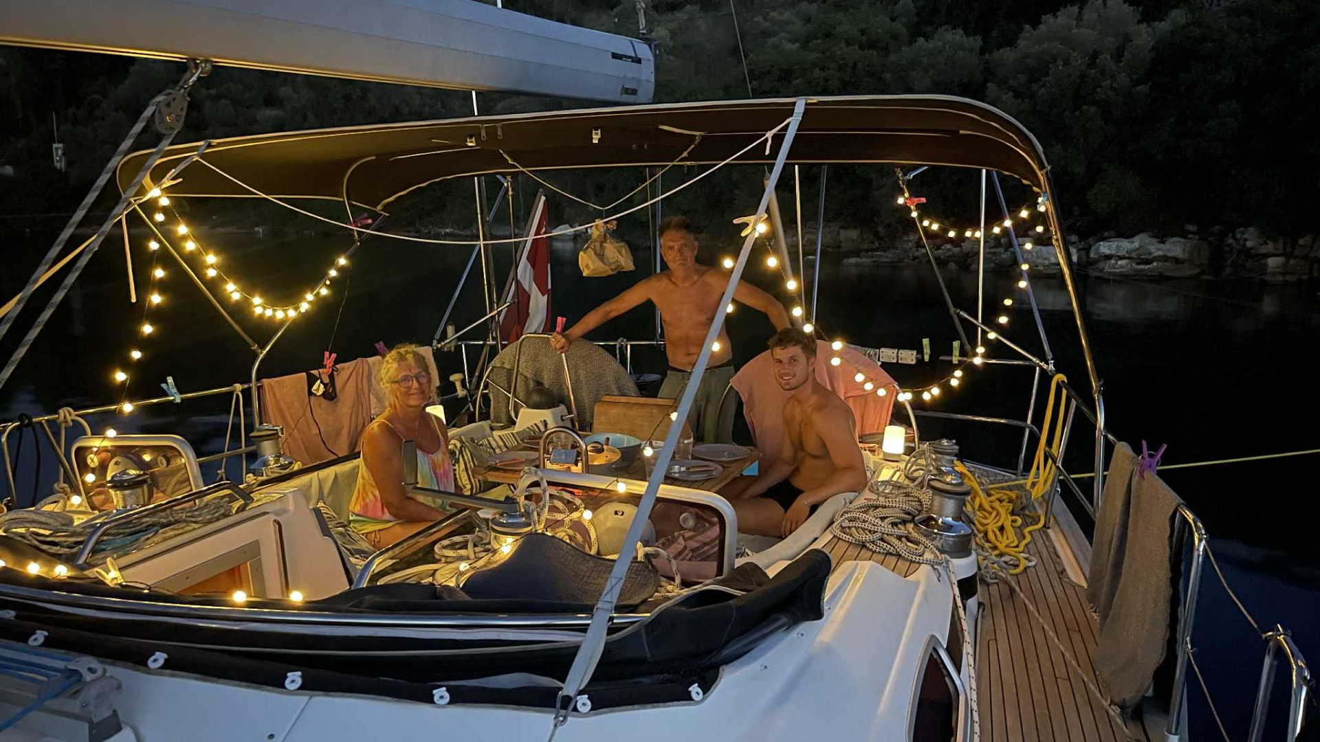 De sidste par dage har været varmt og vi har lagt for anker med liner i land ved Meganissi. Her er der blevet badet, spillet kort, lavet dejlig mad og set på stjerneskud. Sikke et flot skue.